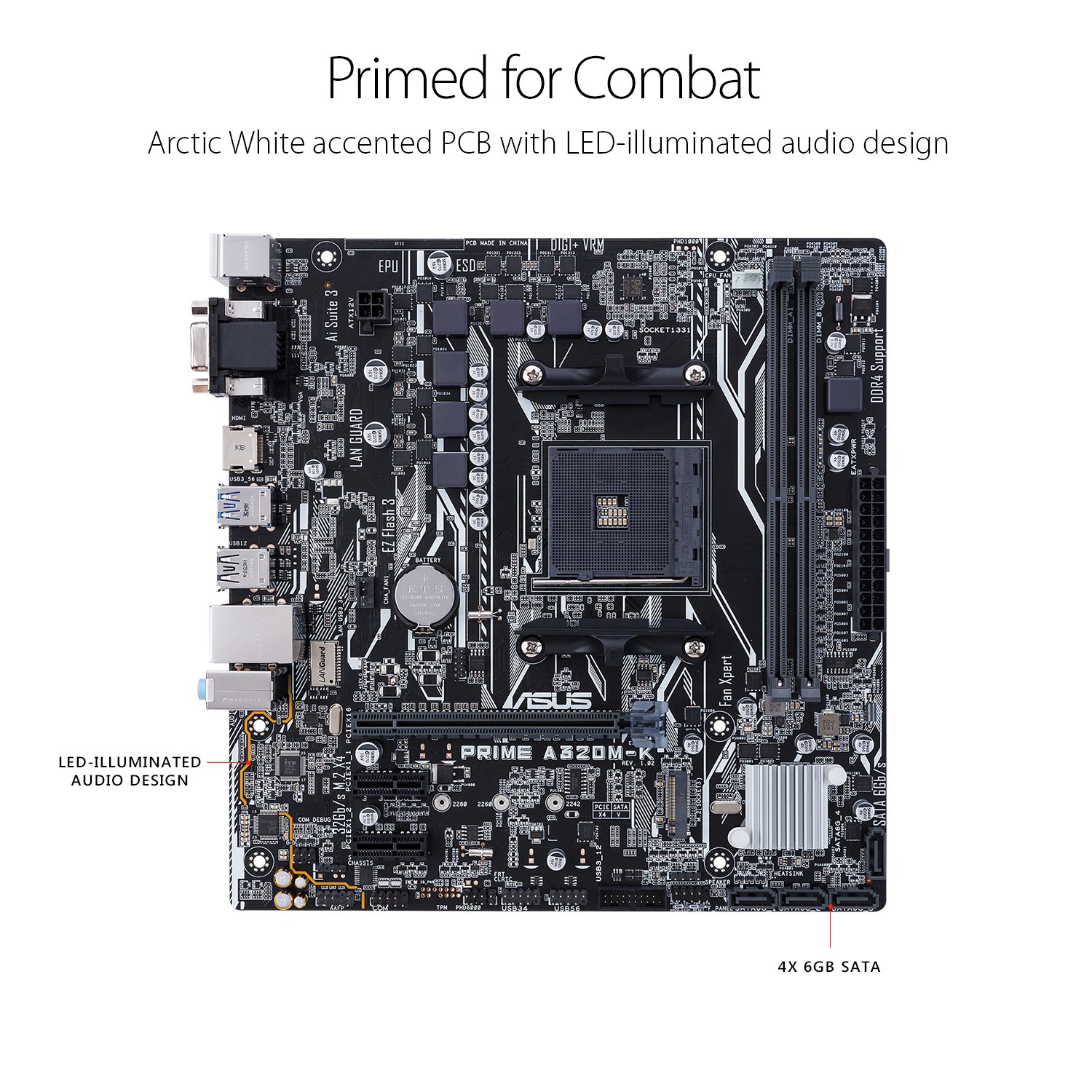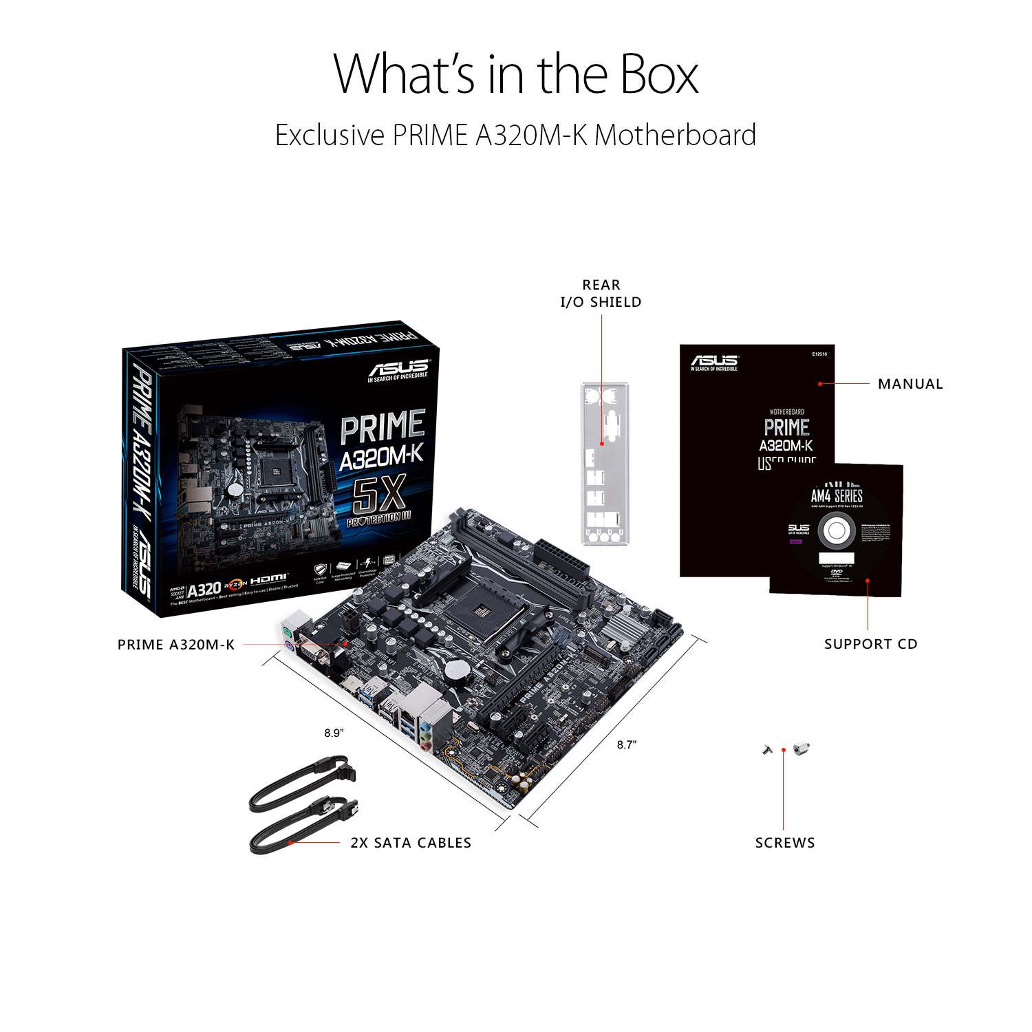 | Mounting Hardware | M.2 screw package, Serial ATA 6.0Gb/s cables(2), I/O shield, User manual, PRIME A320M-K motherboard |