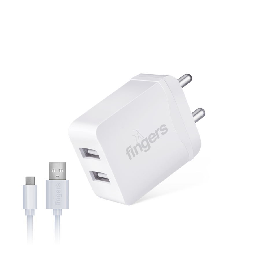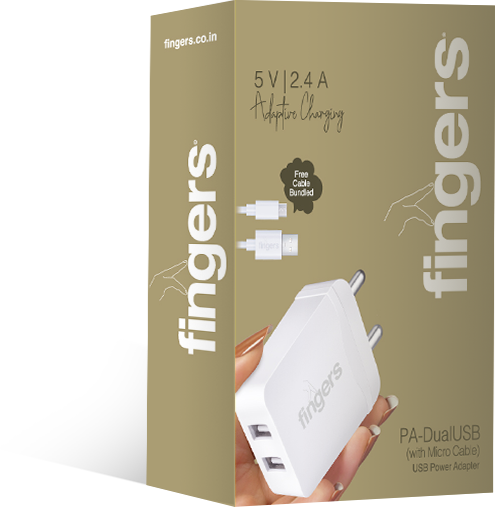 Plug in the charging cable1 and use compact and portable USB-based power adapter to charge your USB-based digital gadgets in no time. FINGERS PA-DualUSB (with Micro USB Cable) Power Adapter  is engineered to be a brilliant channel of power. Built with superior quality delivering 5 V, 2.4 A max. output power and equipped with safety protection layers against over-current, over-voltage, short-circuit and over-heating – it ensures adaptive and efficient charging.